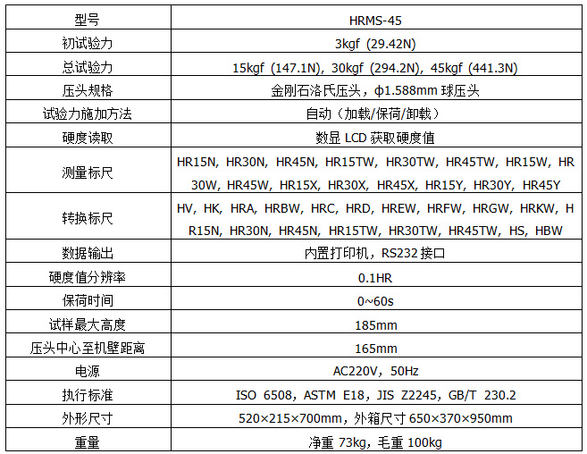 HRMS-45數(shù)顯表面洛氏硬度計是集機(jī)、電一體化的高新技術(shù)產(chǎn)品,可進(jìn)行表面洛氏硬度測試。該儀器造型新穎、美觀,LCD液晶屏可顯示和設(shè)置當(dāng)前測試標(biāo)尺、試驗(yàn)力、測試壓頭、保荷時間、硬度轉(zhuǎn)換值、壓頭類型等,其主要功能如下:表面洛氏硬度標(biāo)尺的選擇;各硬度標(biāo)尺之間的換算值;硬度測試結(jié)果可保存查看及打印輸出,自動計算最大、最小、平均值;配有RS232接口供用戶連接電腦輸出。