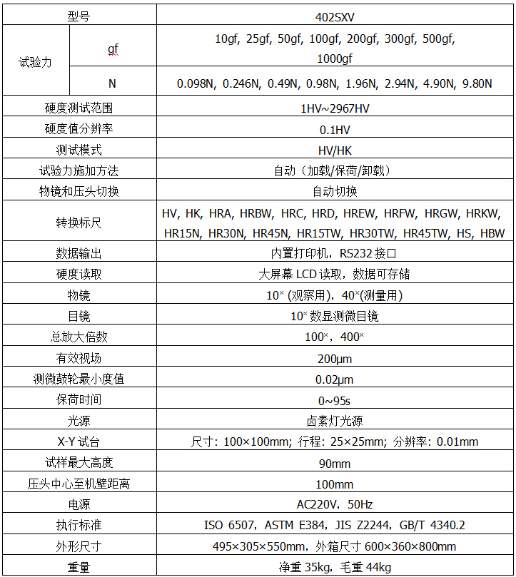 402SXV數(shù)顯顯微維氏硬度計(jì)是光、機(jī)、電一體化的高新技術(shù)產(chǎn)品,它造型新穎、美觀,內(nèi)部結(jié)構(gòu)多用不銹鋼零件組成,性能更佳。在大屏幕上能更加直觀地顯示試驗(yàn)方法、試驗(yàn)力、壓痕長度、保荷時(shí)間、測量次數(shù)、轉(zhuǎn)換標(biāo)尺、日期時(shí)間,操作時(shí)只要測量壓痕按目鏡按鈕,即可自動(dòng)計(jì)算出硬度值并顯示在屏幕上。具有上下限報(bào)警功能,數(shù)據(jù)結(jié)果可以保存通過表格查看,也可通過內(nèi)置打印機(jī)輸出,并配有RS232接口供用戶連接電腦輸出?蛇x配努氏壓頭進(jìn)行努氏硬度測量,也可選配LCD視屏測量裝置和CCD圖像自動(dòng)測量系統(tǒng)。