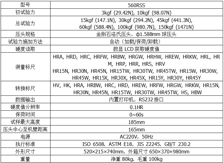 560RSS數(shù)顯雙洛氏硬度計(jì)外形新穎、功能齊全、操作方便、顯示清晰直觀、性能穩(wěn)定,是集機(jī)電于一體的高新技術(shù)產(chǎn)品,可進(jìn)行洛氏、表面洛氏全部標(biāo)尺的硬度測(cè)試。可顯示和設(shè)置當(dāng)前測(cè)試標(biāo)尺、試驗(yàn)力、測(cè)試壓頭、保荷時(shí)間、硬度轉(zhuǎn)換值、壓頭類型等,其主要功能如下:洛氏、表面洛氏硬度標(biāo)尺的選擇;各硬度標(biāo)尺之間的換算值;硬度測(cè)試結(jié)果可保存查看及打印輸出,自動(dòng)計(jì)算最大、最小、平均值;配有RS232接口供用戶連接電腦輸出。
