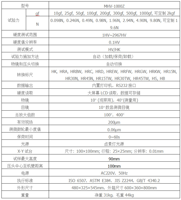 MHV-1000Z數(shù)顯顯微維氏硬度計(jì),在機(jī)械、光學(xué)、光源上采用獨(dú)特精密設(shè)計(jì),使壓痕成像更清晰,測(cè)量更精確。配備數(shù)顯測(cè)微目鏡,不用查表,也不用輸入壓痕對(duì)角線,在大屏幕上能更加直觀地顯示試驗(yàn)方法、試驗(yàn)力、壓痕長(zhǎng)度、保荷時(shí)間、測(cè)量次數(shù)、轉(zhuǎn)換標(biāo)尺、日期時(shí)間,操作時(shí)只要測(cè)量壓痕按目鏡按鈕,即可自動(dòng)計(jì)算出硬度值并顯示在屏幕上。數(shù)據(jù)結(jié)果可以保存通過(guò)表格查看,也可通過(guò)內(nèi)置打印機(jī)輸出,并配有RS232接口供用戶(hù)連接電腦輸出?蛇x配努氏壓頭進(jìn)行努氏硬度測(cè)量,可選配2kg試驗(yàn)力,也可選配LCD視屏測(cè)量裝置和CCD圖像自動(dòng)測(cè)量系統(tǒng)。