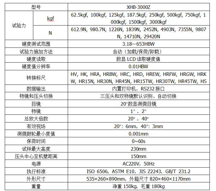XHB-3000Z三壓頭數(shù)顯布氏硬度計采用精密的結(jié)構(gòu)設(shè)計,試驗力施加由力傳感器直接控制,使整機結(jié)構(gòu)緊湊,加卸試驗力平穩(wěn)、準確。在電氣上由CPU控制試驗過程,物鏡和壓頭間采用自動切換,切換定位采用機械與電子雙重配合,使定位精度更高。本儀器具備10級試驗力,13種布氏硬度的測試標(biāo)尺,可任意選擇;具備了三個壓頭和兩個物鏡,都能自動參與測試,物鏡和壓頭間默認識別、自動切換;可預(yù)置試驗力保持時間、調(diào)節(jié)測量壓痕光源的強弱;顯示測量壓痕長度、硬度值、測量次數(shù)等;具備硬度標(biāo)尺轉(zhuǎn)換功能;數(shù)據(jù)結(jié)果可以保存并通過表格查看,也可通過內(nèi)置打印機輸出,并配有RS232接口供用戶連接電腦輸出。硬度計還可根據(jù)用戶特殊需求配置視屏測量裝置和CCD圖像自動測量系統(tǒng)。