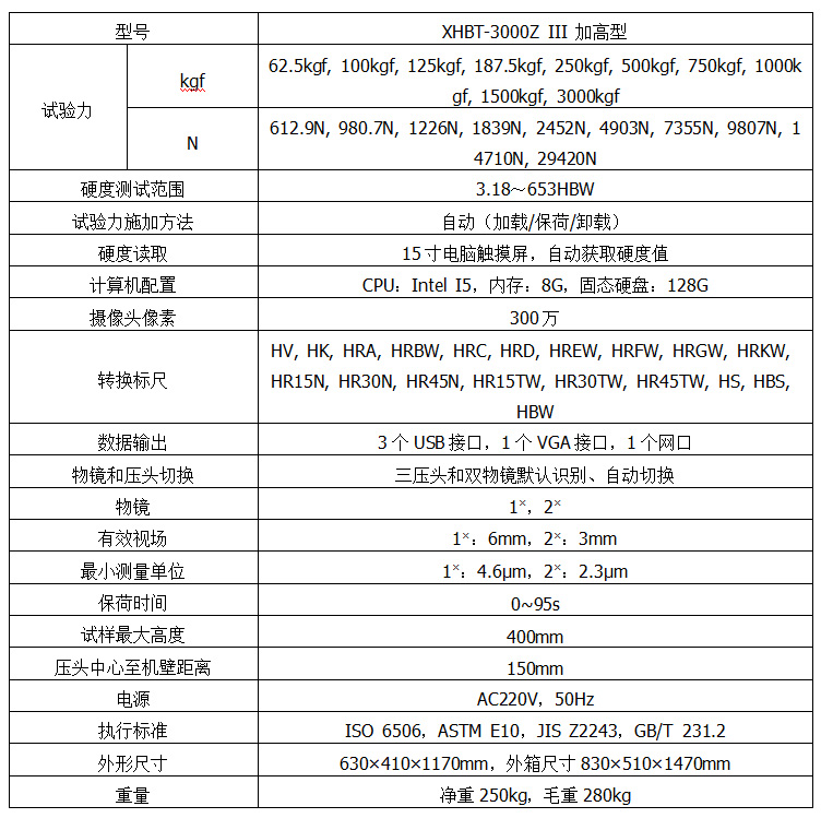 XHBT-3000Z III全自動三壓頭數(shù)顯布氏硬度計采用精密結(jié)構(gòu)設(shè)計,試驗力施加由力傳感器直接控制,使整機(jī)結(jié)構(gòu)緊湊,加卸試驗力平穩(wěn)、準(zhǔn)確。在電氣上由CPU控制試驗過程,物鏡和壓頭間采用自動切換,切換定位采用機(jī)械與電子雙重配合,使定位精度提高。內(nèi)置觸摸屏,微型電腦,使參數(shù)設(shè)定、結(jié)果顯示更加直觀,操作更加便捷,也避免了顯微鏡的光源給眼睛帶來的刺激和視覺疲勞,減少了測量誤差。選擇相應(yīng)的標(biāo)尺開始后,硬度計將自動選擇壓頭及物鏡,平臺自動上升,施加完試驗力后自動回到聚焦面,壓痕清晰顯示并自動測量,實現(xiàn)了布氏測量的全自動化。此款為加高型,適用于更多大型工件測定的需求。
